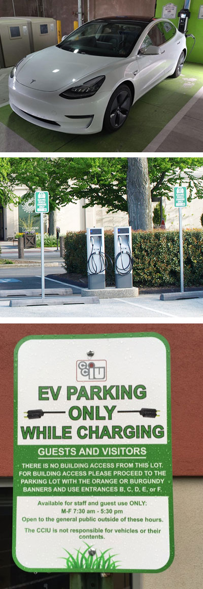 Charging stations are a critical component of supporting EV use. Top to bottom: parking facility in West Chester; visitors' parking lot at Longwood Gardens; and the Chester County IU in Downingtown.