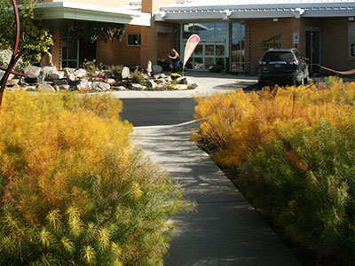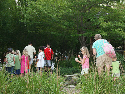 A feature that allows runoff from paved areas to flow into a shallow basin containing plants that absorb nutrients and remove pollutants. Rain gardens also help reduce the overall volume of stormwater runoff and associated erosion, while recharging groundwater supplies.
