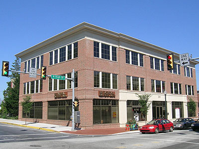 This office building in West Chester is built close to the street, with parking behind the building.