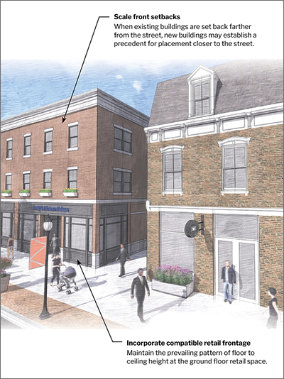 A key consideration regarding infill development is the compatibility of a new building's design and placement within the context of surrounding buildings and neighborhoods. This is especially important along main streets within urban centers, villages in rural centers and suburban areas, and contiguous residential neighborhoods around the county. In these situations, infill development is in greater proximity to existing development and will have a significant impact in terms of consistency with existing development patterns, historic resources, architecture, and the public realm (streetscape, building façade, sidewalk, public spaces, pedestrian perspective).