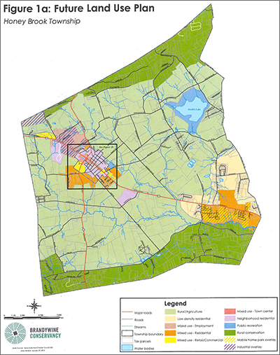 Honey Brook Township and Borough have participated in joint comprehensive plans since the early 1990s; their most current plan, which embraces smart growth principles, was adopted in 2015. Like the Unionville Regional Plan, the Honey Brook Comprehensive Plan clearly defines growth areas and areas for preservation. The plan promotes the borough as the site for community and economic development where future residential development will be served by public utilities and be located close enough to permit residents to walk to the retail and entertainment facilities on Horseshoe Pike. Beyond the borough the plan designates a majority of the township as rural/agriculture or rural conservation to maintain "…rural character, with particular emphasis on agriculture as a viable way of life." These two municipalities have developed a good working relationship and have incorporated shared uses in their ordinance documents.