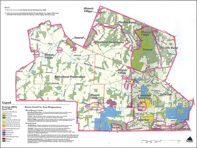 Smart growth principles are incorporated in the plan by recommending development in or near areas of high density that have existing access to utilities and major roads. The areas designated for growth include Unionville and Willowdale villages and areas adjacent to the Borough of Kennett Square. The plan also designates rural resource areas to protect the region's economic and cultural resources associated with active agriculture, open space, and natural lands. West Marlborough and Newlin Townships and the western portion of East Marlborough are designated as rural resource areas with limited development opportunities. This designation helps Both East and West Marlborough Townships have agricultural zoning in place to regulate development in the Rural Resource areas.