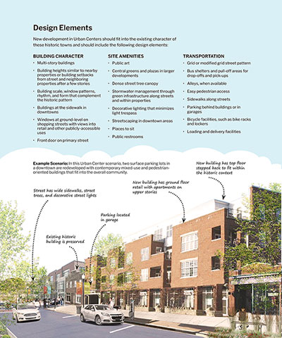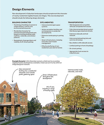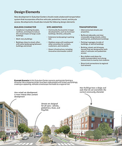 Landscapes3 highlights a variety of special design elements for different types of communities around the county, and the Planning Commission's Urban Centers Landscapes Design Guide and Suburban Centers Landscapes Design Guide provide more details on potential zoning approaches to improve development design.