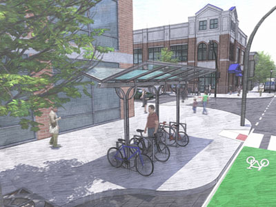 Expansive impervious surfaces such as parking areas or wide sidewalks with little vegetation can be assessed to determine if they are overdesigned for size and underdesigned for landscaping. Sometimes it is possible to green a portion of a parking lot that is not used or to install street trees within an existing sidewalk.