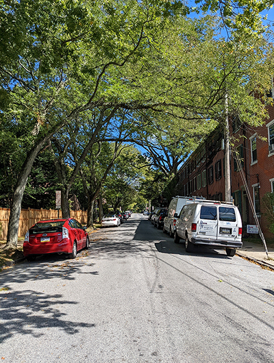 Mature honey locust trees on a residential street in West Chester Borough create dappled shade and enhance the streetscape.