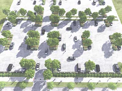 The most attractive and arguably the most functional and sustainable parking areas are those that are well landscaped. Trees provide valuable additions to parking areas, whether planted in curbed islands or located on the parking area perimeters. Trees provide shade, visually reduce the mass of open pavement, help absorb and filter stormwater runoff, block light and dust, and mitigate heat. The following are some general considerations for how plant materials can be used to improve parking facilities: