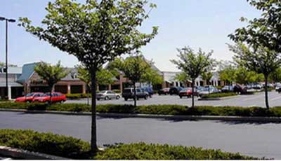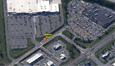 Example of a transit stop centrally located within a commercial development with connecting walkways extending through parking areas, Northampton, PA.