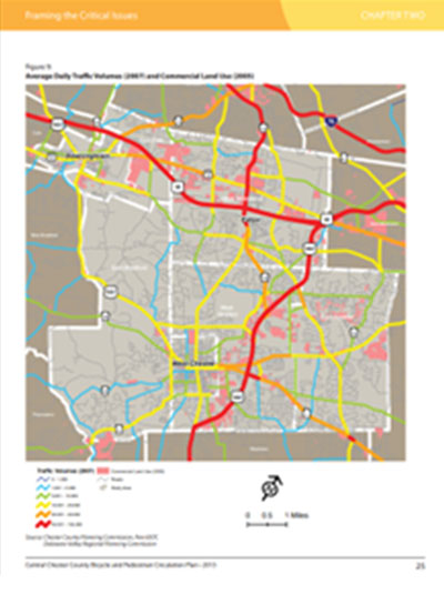Understanding the current roadway system is an important first step in developing a bicycle and pedestrian network plan, such as this example of traffic volumes from the Central Chester County Bicycle and Pedestrian Plan.